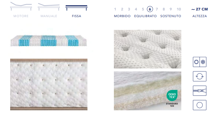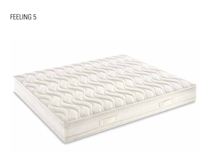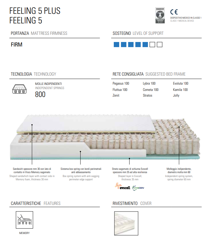 Feeling 5 Plus e Feeling 5 sono dotati di 800 molle indipendenti (ø 6 cm ca), che offrono un sostegno uniforme e progressivo, con una risposta equilibrata alle diverse pressioni esercitate dal corpo. Il profilo superiore in Memory bugnato si modella in modo preciso, riducendo i punti di pressione e favorendo una distribuzione più armoniosa del peso. Il profilo inferiore sagomato a zone in Evocell, certificato Hygcen®, garantisce traspirabilità, igiene e stabilità all’intera struttura. Completa la struttura il box spring, per una maggiore stabilità.