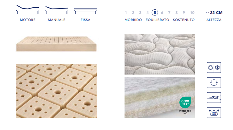Optima è un materasso in lattice di origine 100% naturale. La schiuma di lattice naturale, proveniente dal fusto dell‘Hevea Brasiliensis, è caratterizzata da una struttura indeformabile ad alveoli che la rende elastica. Il disegno della struttura è progettato a cubotti per aumentare la traspirazione e l’igiene. La foratura impedisce la proliferazione di batteri. Optima offre un comfort ideale per qualsiasi esigenza di riposo.