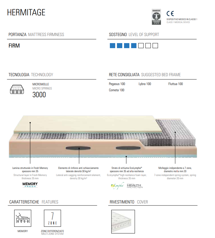 Hermitage è caratterizzato da una struttura a 3000 micromolle indipendenti con diametro 20 mm, che reagiscono singolarmente ai carichi corporei, offrendo un supporto estremamente preciso e progressivo.