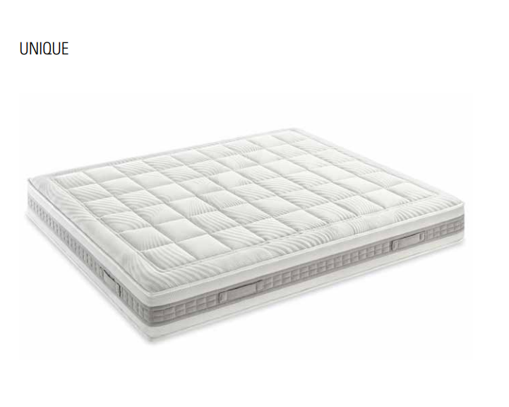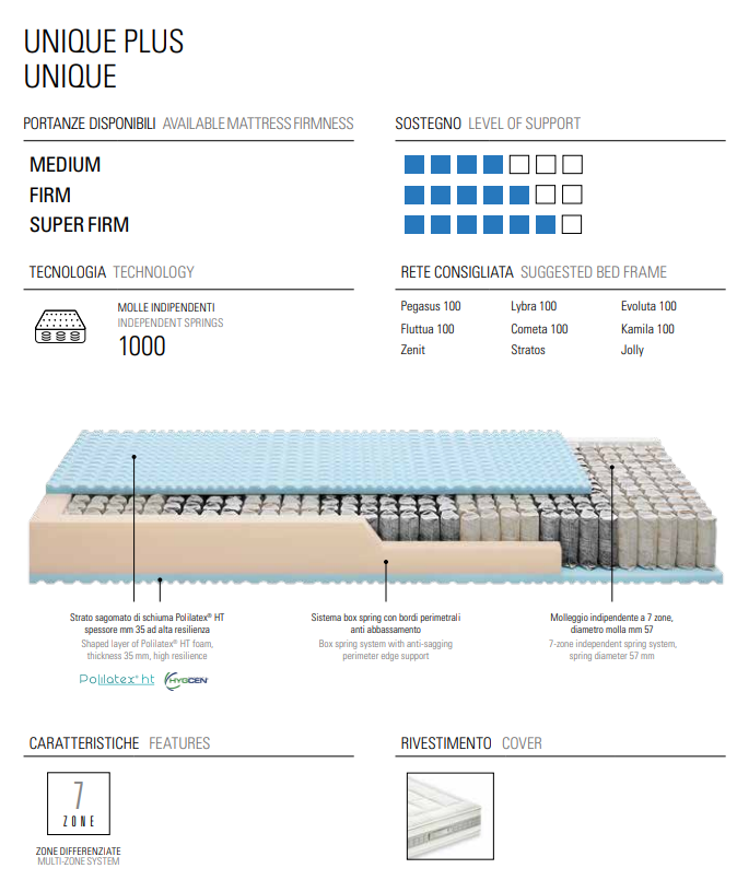 I modelli Unique e Unique Plus sono dotati di 1000 molle indipendenti (ø 5,7 cm ca) a 7 zone di portanza differenziata, progettate per offrire un sostegno calibrato e una sensazione di stabilità controllata. I profili sagomati a zone sono composti da Polilatex® HT, che garantisce traspirabilità e un supporto deciso. Il box spring perimetrale contribuisce alla stabilità del sistema e limita la compressione laterale